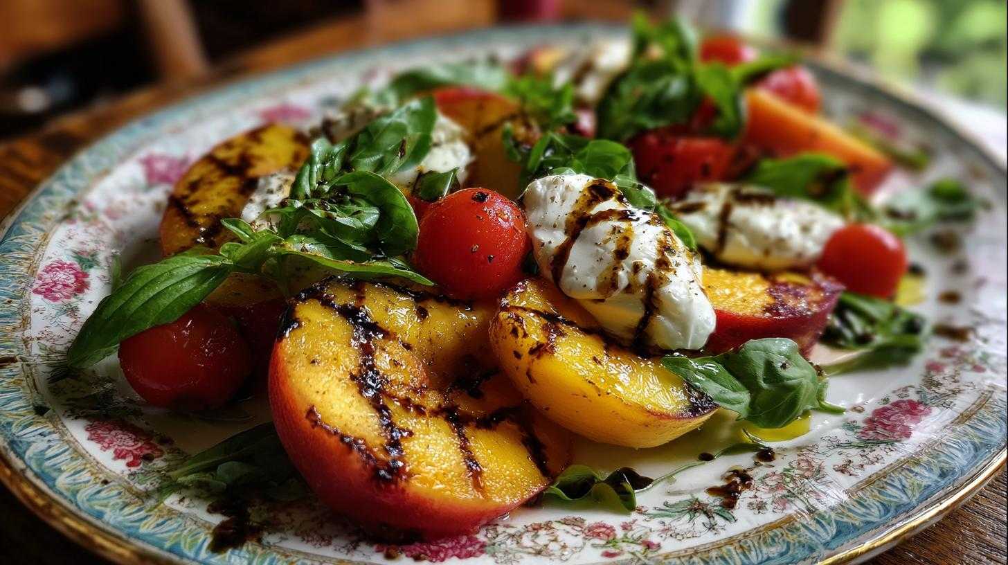 A delightful twist on the classic Caprese salad, featuring sweet grilled peaches, creamy burrata, fresh basil, and a balsamic glaze.